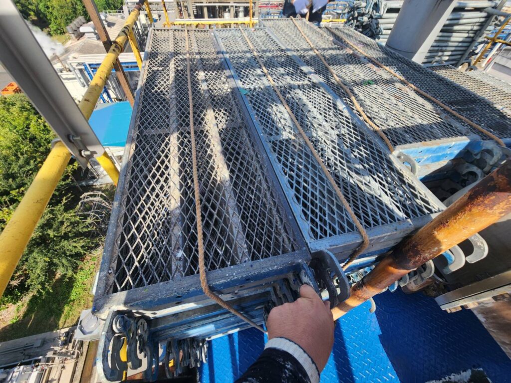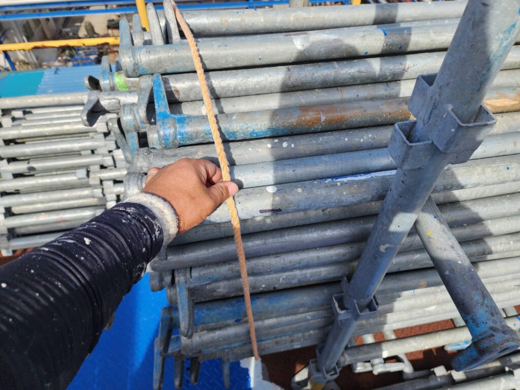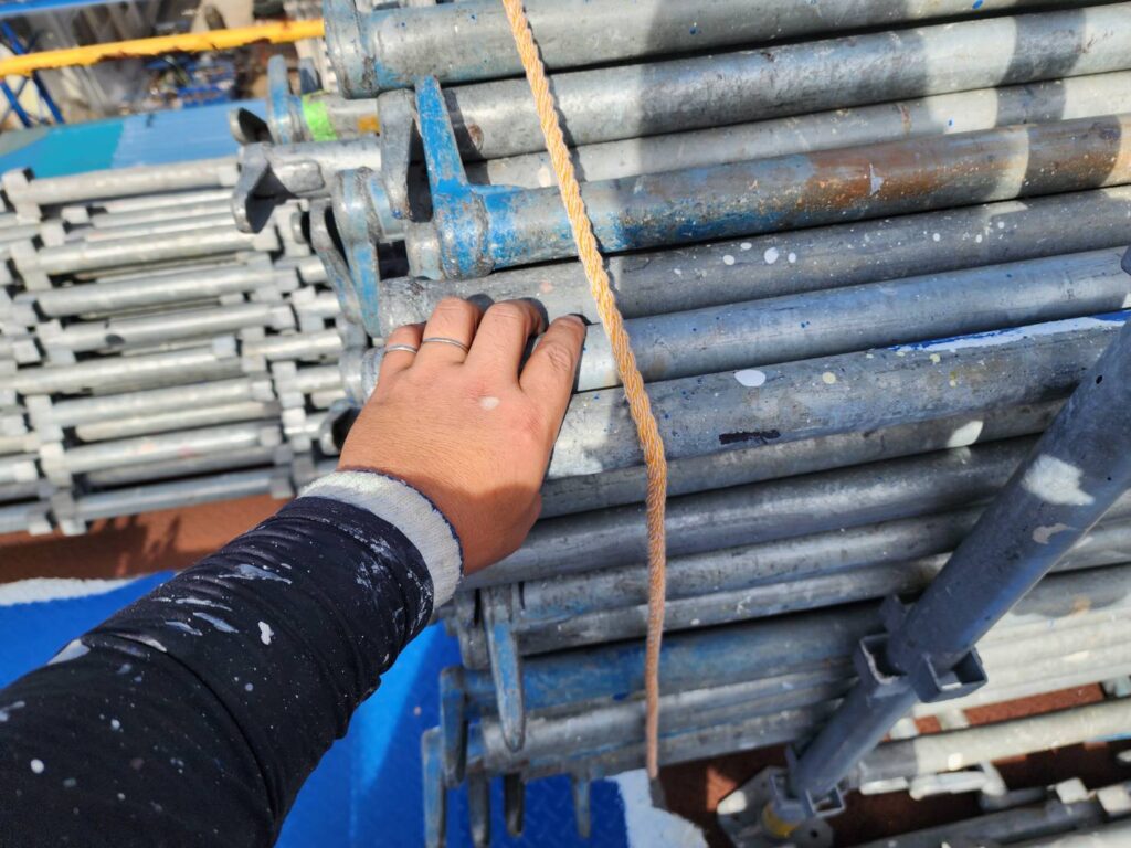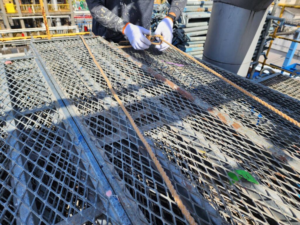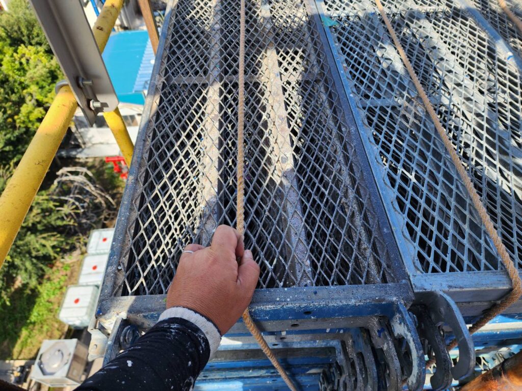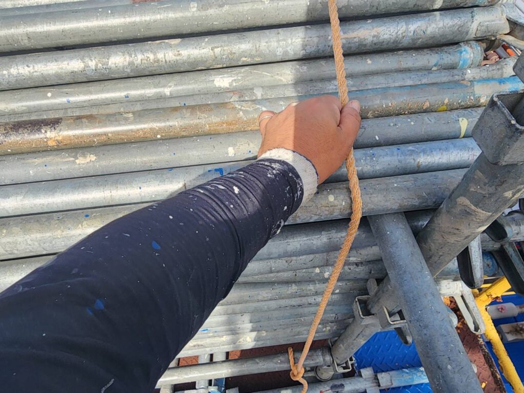 足場の上にある資材や足場板などが飛ばされないよう、全て撤去するか、ネットやロープでしっかりと固定します。