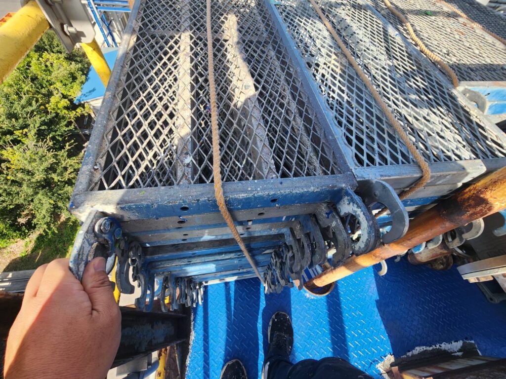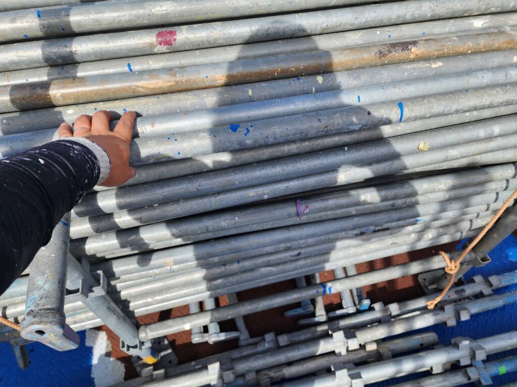 足場本体の部材が緩んでいないか、金具のゆるみや変形がないか点検します。